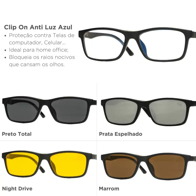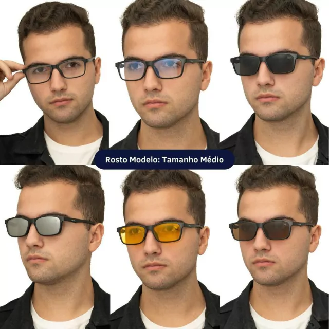 Acompanha as lentes: Preto Total, Marrom, Prata Espelhado, Anti Luz Azul e Night Drive.