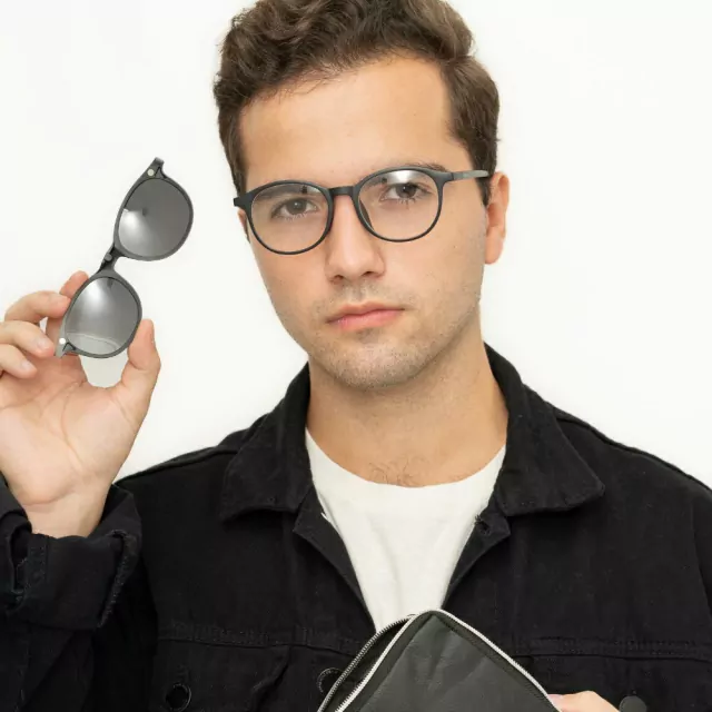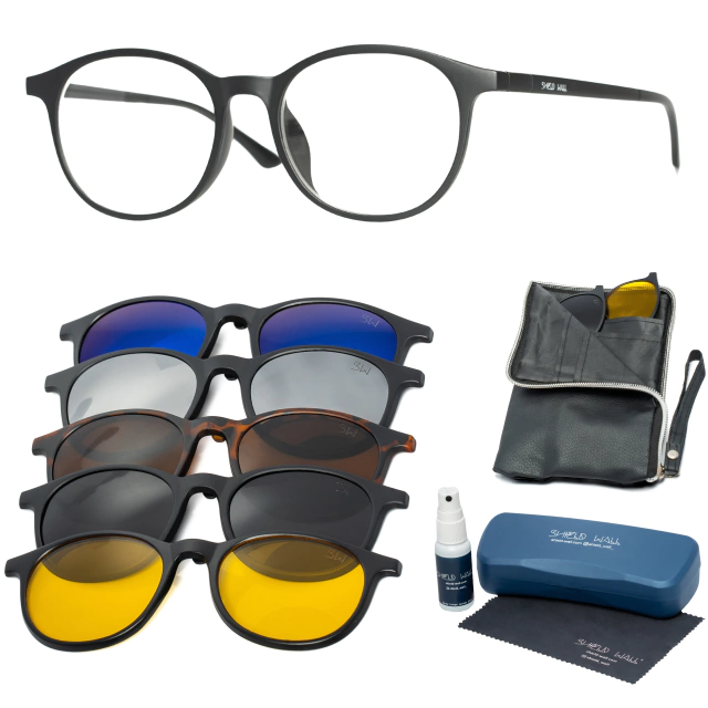 Os óculos clipon 5 em 1 tem o melhor custo-benefício que você poderia encontrar. O conjunto funciona assim: Você faz as lentes de grau apenas na armação, e fazendo o encaixe dos clips você tem 5 opções de óculos de sol com grau!
