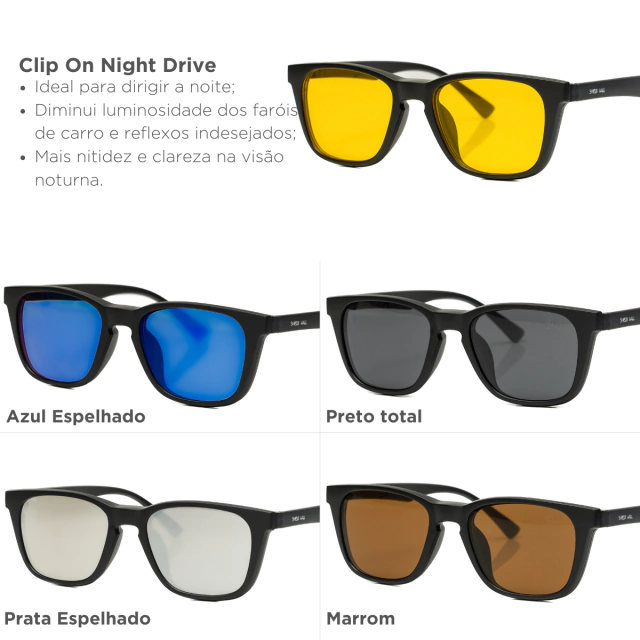 Acompanha as lentes: Preto Total, Marrom, Prata Espelhado, Azul Espelhado e Night Drive.